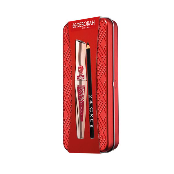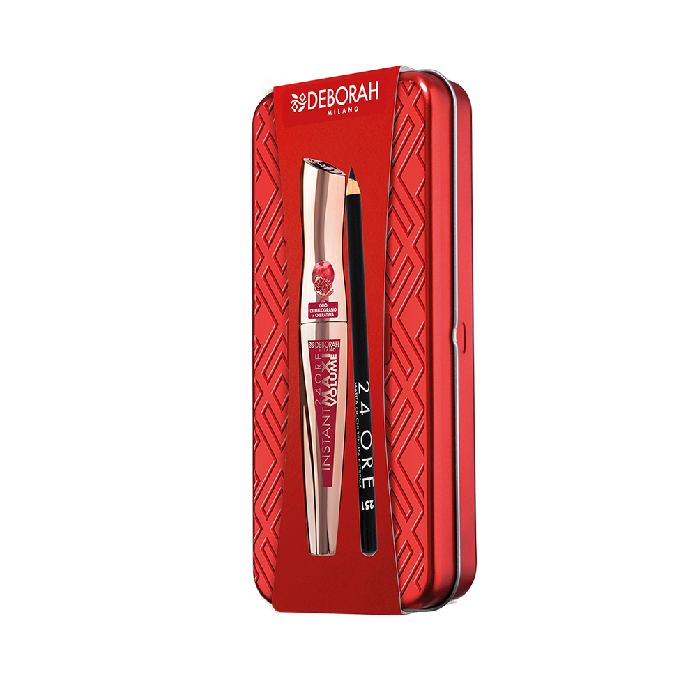 Contiene: astuccio in latta color rosso, Mascara Instant Maxi Volume con Melograno, Matita Occhi 24 Ore Nera