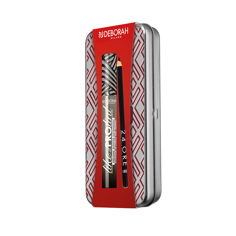 Contiene: astuccio in latta color argento, Mascara Like a Pro Tint, Matita Occhi 24 Ore Nera