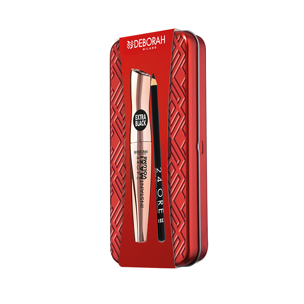 Contiene: astuccio in latta color rosso, Mascara Instant Maxi Volume_Extra Black, Matita Occhi 24 Ore Nera